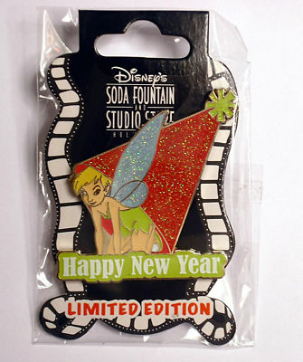 To celebrate this new year the Disney Soda Fountain released this pin that features Tinker Bell on her knees under a big sparkling red party hat. The bottom of the pin reads "Happy New Year" in white lettering on a green background