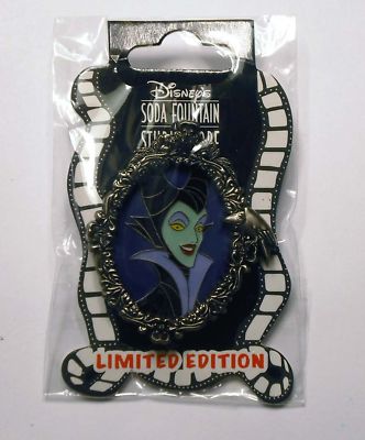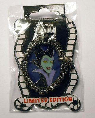 This pin features an oval shaped frame that has a portrait of Maleficent