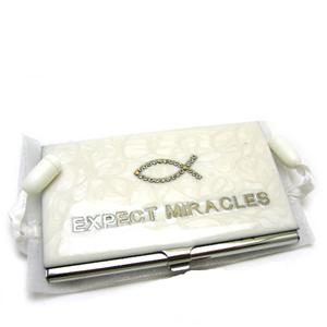 Plated in highly polished stainless chrome, embedded with brilliant clear crystals, and embossed with Glossy White Swirled enamel~ This exquisite business card holder will add a touch of femininity to any ones business attire. The inside features a black velvety suede lining, the back side is mirrored so that you can do a quick check on your makeup! It can also be used to hold your credit cards! What a beautiful accessory!