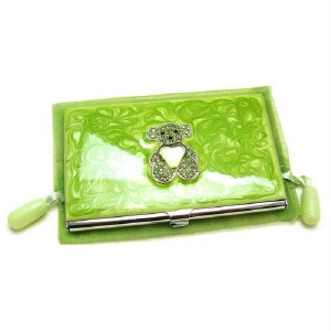 Plated in highly polished stainless chrome, Green enamel Top Embedded with a Green and Aurora Borealis Brilliant Crystal Bear with Black Enamel Eyes and Nose holding a Clear Crystal Heart Gemstone~ This exquisite business card holder will add a touch of femininity to any ones business attire. The inside features a black velvety suede lining, The Back side is mirrored so that you can do a quick check on your makeup! It can also be used to hold your credit cards! What a beautiful accessory!