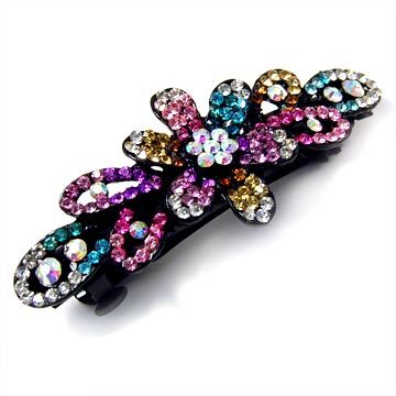 Black coated 3.3" long barrette decorated with many sparkling clear and Multi colored rhinestones in flower design. Nice quality, well made barrette Free Shipping to USA Buyers with a Purchase of $50.00 or more! Add me to your Favorite Sellers On Nov-07-10 at 21:56:07 PST, seller added the following information: