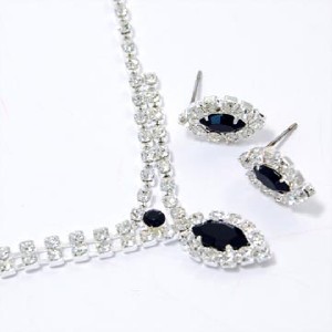 Shimmering clear crystal studded 14" long necklace with lobster clasp and 2.25" extension - front area features short second strand of crystals, and small dangling jet crystal and "cat's eye" black crystal pendant. Matching earrings, post. Austrian crystals. Lead and nickel free.