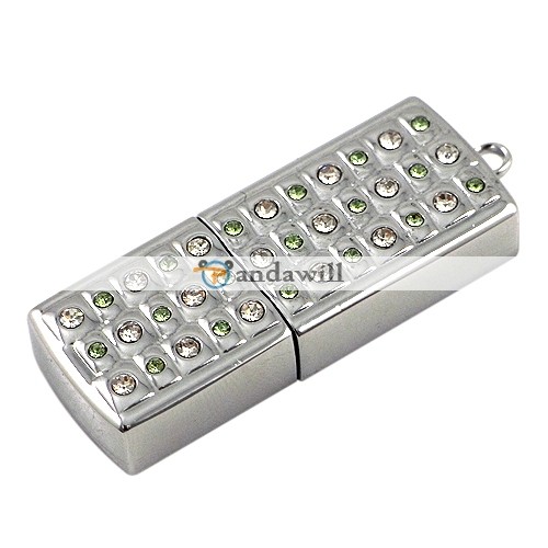 4GB Flash Memory Disk Rectangle Silver With White & Green Crystal - Sku# PW5632
