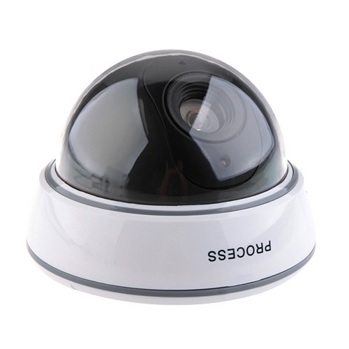 Now you can deter robbery, theft, and vandalism without the high cost of a real security camera. When this dummy camera is placed in your home or office, even the most sophisticated criminals will think the premise is guarded by a high-tech surveillance system. In fact, this is an actual surveillance camera that has been modified into a "dummy" or fake security camera. This camera has LED flashing light, it requires 3 AA batteries that are not included.