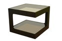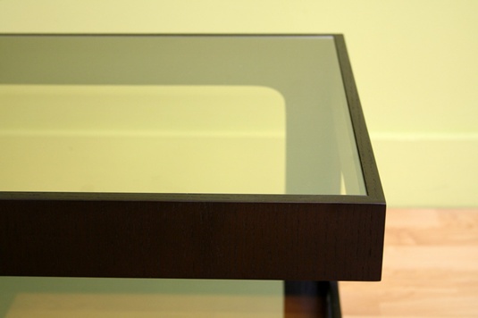 A unique side table option, this professional-looking contemporary table offers dual tempered glass surfaces for storage and display. The black oak frame descends from the top surface to the bottom in two opposite corners, leaving the bottom space more open with a wider gap for easy access. Consider purchasing either two or four of this design and arranging them together as a coffee table.