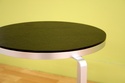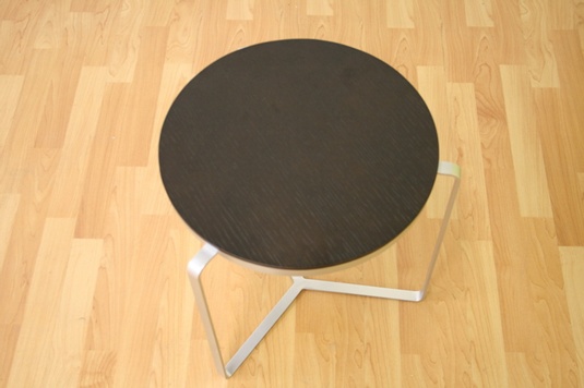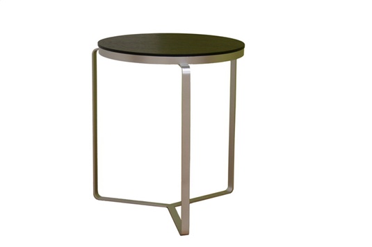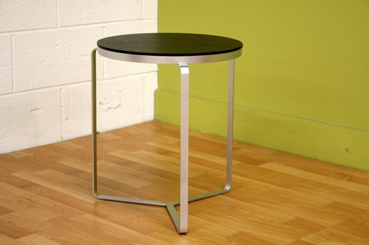 • Small round side table with black oak surface • Powder-coated steel legs and frame • 3 felt pads for floor protection, one on each leg