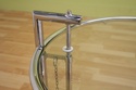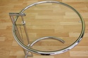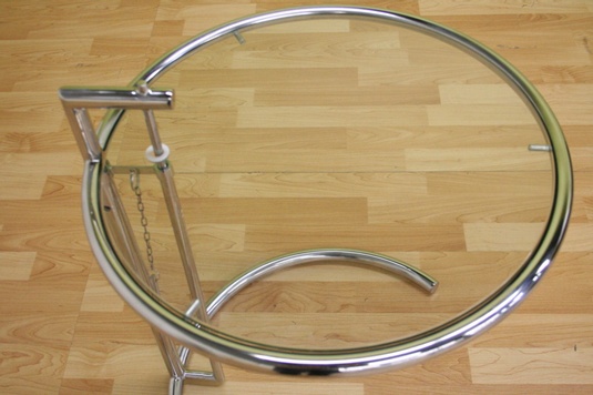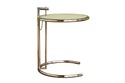 Eileen Gray Stainless Steel Accent Table made of a polished stainless steel frame and a clear glass top. Table top is height adjustable.