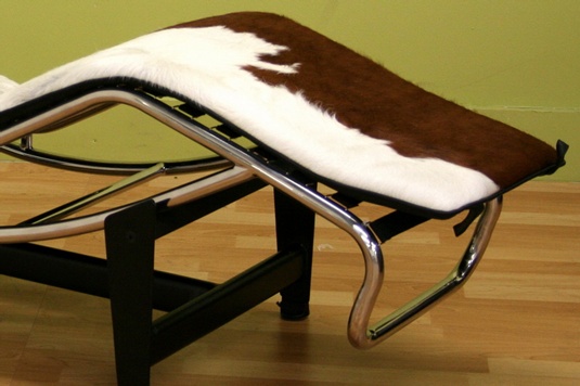 SKU: 990A Br & Wh Adjustable Pony Skin Chaise Lounge constructed of a durable steel frame in black, highlighted by stainless steel accents, upholstered in Pony Skin with Black Leather pillow, comfortable foam fill seating with rubber band backing, adjustable chaise design.