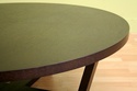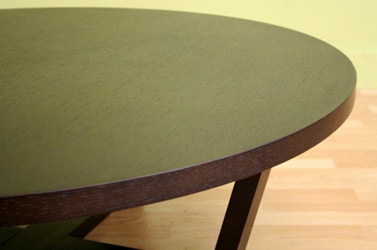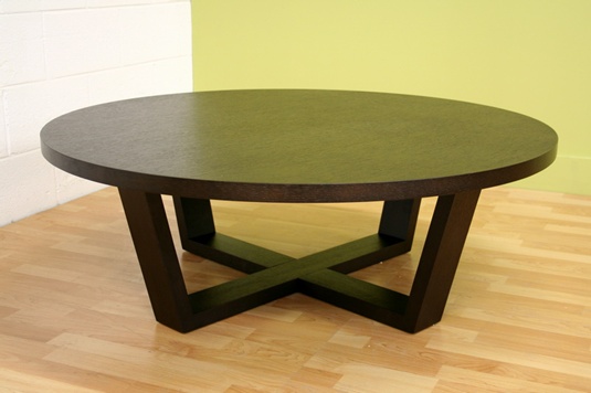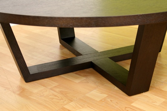 • Black-stained oak large round coffee table • Inward-slanting legs connect at center • 2 black foam pads on each leg for protection of flooring