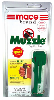 EPA approved Mace™ Muzzle provides safe, effective and humane protection against canine attack. Ideal protection for walkers, joggers, cyclists or delivery people. - Features flip-top safety cap, finger-grip dispenser, belt clip and keychain. - 17 gram unit sprays up to 10 feet. - Contains 10 one second bursts.