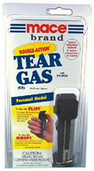 Michigan Double-ActionTM CS Tear Gas combines CS TEAR GAS and UV DYE. Available with standard safety features. Personal Model - 17 gram unit sprays 8-12 feet. Contains 10 one second bursts.