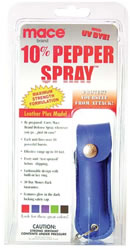 Attractive MACE PEPPER SPRAY LEATHERETTE MODELS fit easily in a pocket or purse. Features glow-in-the-dark locking safety cap and keyring. 11 gram stream unit sprays up to 10 feet. Contains 5 one second bursts. Available in five fashionable colors: red, black, blue, purple and green. Includes key ring.