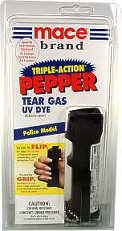 MACE TRIPLE-ACTION combines OC PEPPER with CN TEAR GAS along with a UV MARKING DYE. OC PEPPER causes eyes to slam shut and uncontrollable coughing and choking. CN TEAR GAS causes profuse tearing, an intense burning sensation to the face and disorientation. UV DYE marks the assailant and may aid in identification once apprehended.