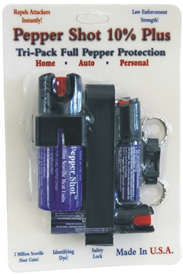 PEPPER SHOT TRI-PACK You get Total Pepper Protection with this handy collection of 3 pepper sprays at one low price. A 2 ounce pepper spray for home use, a 1/2 ounce auto visor clip to keep in your vehicle, and a 1/2 ounce pepper spray with a Quick Key Release key chain.