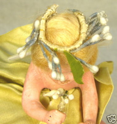 FOLKS THIS IS A WAX ANGEL.........THE BODIES ON THESE ANGELS WERE COMPOSITION..............MADE OF SAW DUST AND PASTE...........SO THE BODIES ARE CRUDE........THEY DID NOT SAND THEM AS THEY DID WITH THE MAMA DOLLS...........THEY LEFT ON BUMPS AND RIDGES AND COVERED THE COMPOSITION WITH WAX..........HER PAINTED FACE IS A LOT BETTER THAN MOST.............AND HER HAIR IS JUST BEAUTIFUL AND APPEARS TO BE OF MOHAIR AND IS STILL IN THE CONDITON IT WAS MADE BECAUSE AS A ANTIQUE DOLL COLLECTOR I KNOW YOU CAN NOT REDO MOHAIR AND IT IS RARE TO FIND ONE WITH SUCH PRETTY HAIR......... MOST OF THESE ANGELS LOOK LIKE THEY WERE SCALPED:).........HER HAIR PIECE IS MADE WITH WAX FLOWERS.............AND SHE HAS A SPRIG OF THE SAME FLOWERS IN HER HAND.............I DO NOT THINK THIS IS HER ORIGINIAL DRESS BUT IT IS BETTER............IT IS OF A SATIN MATERIAL AND THE WAY IT WAS SEWN I THINK IT WAS MADE TO LOOK LIKE FLOWER PETALS AND THE REASON I HAVE NEVER TOUCHED HER SKIRT.........SHE IS JUST AS I FOUND HER...........SHE IS ABOUT 5" LONG..........A LITTLE HARD TO MEASURE BUT 5" IS CLOSE...........NO BROKEN LIMBS...........STILL HAS HER WINGS.............THE PAINTING ON HER FACE IS BETTER THAN MOST ANGELS LIKE THIS......INSURANCE INCLUDED WITH SHIPPING.....THANKS FOR LOOKING AND CHECK OUT OUR OTHER CHRISTMAS ITEMS..............IF YOU HAVE ANY ?S...........PLEASE EMAIL ME.