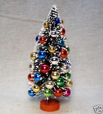VINTAGE BOTTLE BRUSH TREE.......MADE OF SISAL.....ABOUT 7 & 1/4"......RED WOODEN BASE......THE TREE IS IN GOOD CONDITION ON ALL SIDES......ALL DIFFERENT COLORS OF GLASS BALLS......SOME LOSS OF COLOR TO BALLS AS WOULD BE EXPECTED ON A TREE FROM THE 40S......I WOULD SAY THIS IS A NICE CLEAN TREE IN GREAT CONDITION........IF YOU HAVE ANY QUESTIONS PLEASE EMAIL ME...PLEASE VIEW OUR OTHER LISTINGS FOR MORE CHRISTMAS ITEMS