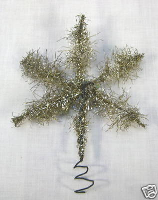 | FOLKS THIS IS A VINTAGE TINSEL STAR TREE TOPPER FOR A SMALL TREE AND IS HARD TO FIND IN THIS SIZE...........MADE WITH LAMETTA TINSEL............ABOUT 4" WITHOUT THE METAL PART THAT GOES OVER THE TREE TOP..............THERE IS AN AQUA FOIL FLOWER SHAPED CENTER WITH A AQUA BEAD IN THE CENTER..............NICE FOR TABLE TOP TREES..........I HAVE SOME GARLANDS LISTED FOR SMALL TREES AND YES THE SIZE OF THE BEADS DO MATTER WHEN PUTTING A GARLAND ON A SMALL TREE.............WE USUALLY DO CHRISTMAS ITEMS FOR ABOUT 2 WEEKS AFTER CHRISTMAS BUT NOT THIS YEAR SO WE DECIDED TO LIST THE ITEMS WITH WATCHERS AND A FEW MORE ITEMS BEFORE WE PUT ALL THE CHRISTMAS ITEMS AWAY FOR NEXT YEAR...........THANKS FOR LOOKING AND IF YOU HAVE ANY ?S......PLEASE EMAIL ME..........                 (2S15)