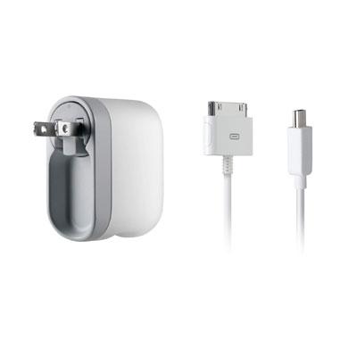 Rotating Dual Charger + ChargeSync. Charge Two USB Devices at the Same Time. Compact & Convenient Charge your iPhone or iPod and mini USB device at the same time, even in crowded outlets. This dual charger lets you plug in two USB devices at one time, and it rotates for ease of use. Plus the folding prongs make it simple to stick in a bag for charging on the go. 4-foot ChargeSync cable lets you connect to your desktop or laptop computer too.