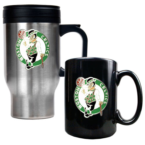 Boston Celtics NBA Stainless Steel Travel Mug & Black Ceramic Mug Set - Primary Logo
