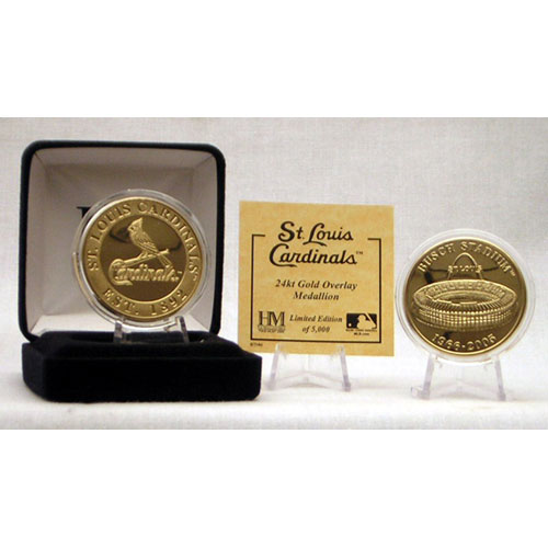 Minting a coin of a historical monument conserves it's legacy forever and as this is the Stadiums final season it's only fitting that we commemorate this Stadium! The Highland Mint received special approval to mint this unique 24KT Gold plate Busch Stadium Coin! The 24KT Gold plated Commemorative Coin is struck to highest standards in minting tradition depicting the stadiums slightest detail. The date on the coin is the date of it's 1st ever game played. The back of the Coin is struck with the teams logo and the franchises established date. Each coin is protected by an acrylic capsule to preserve it's mint condition and presented in a black velour jewelry box for display or protection. As well each coin is accompanied by a certificate of authenticity. This unique collectible is a Limited Mintage of only 5000 and Officially Licensed by Major League Baseball.