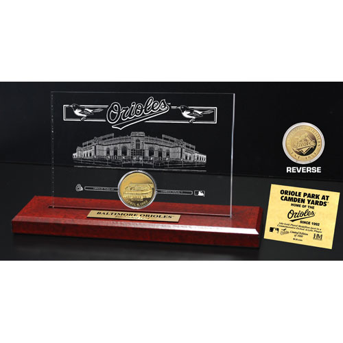 A Limited Mintage of 5000. A minted 24KT Gold overlay Camden Yards Comemorative Coin is beautifully displayed in a 7 x 8" Acrylic with an engraved image of Camden Yards. Each is delivered with a 3" x 11" Cherry Wood Stand for beautiful desktop display as well as a gold engraved nameplate and a Certificate of Authenticity. Each 24KT Gold overlay coin is a Limited Edition of 5000. Officially Licensed by Major League Baseball."