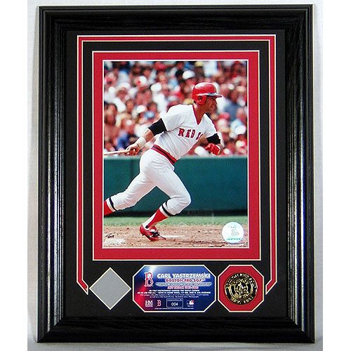 The Highland Mint presents this rare and unique sports collectible: The Carl Yastrzemski Game Used Uniform Photo Mint. 13 x 16" framed and features a double matted action 8" x 10" and a swatch of GAME USED UNIFORM worn by Yastrzemski during an actual MLB Game. Also included is a 24KT Gold Boston Red Sox Coin. Matted between the uniform swatch and coin is an individually numbered C.O.A. Attached to the back of the frame is a flyer verifying the authenticity of the game used uniform Limited Edition of 208!"