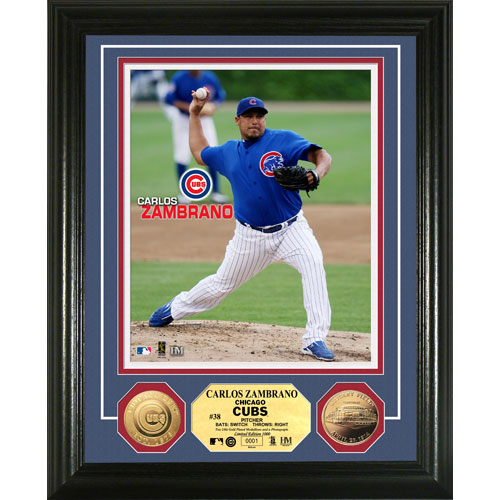 A Limited Edition of only 1000! The Highland Mint features in a 13 x 16" frame with triple matting an individually numbered 8?x10? photo of Carlos Zambrano; a minted 24KT Gold plated Chicago Cubs team Coin and a 24KT Wrigley Field Coin. Limited Edition of 1000 and officially licensed by Major League Baseball and MLBPA."