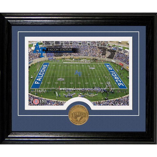 An exclusive photo of the University football field double matted with a minted antique bronze University Logo coin and featured in an 10x12 molded wood frame with an easel back for easy display! Ready to hang on the wall or display on your desk or shelf