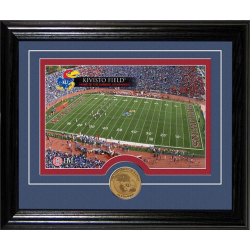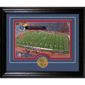 An exclusive photo of the University football field double matted with a minted antique bronze University Logo coin and featured in an 10x12 molded wood frame with an easel back for easy display! Ready to hang on the wall or display on your desk or shelf