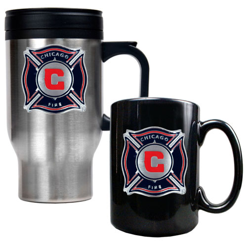 Chicago Fire MLS Stainless Steel Travel Mug and Black Ceramic Mug Set - Primary Team Logo