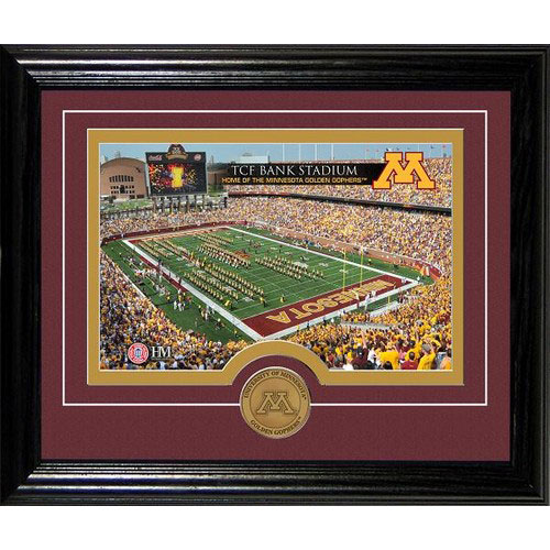An exclusive photo of the University football field double matted with a minted antique bronze University Logo coin and featured in a 10x12 molded wood frame with an easel back for easy display! Ready to hang on the wall or display on your desk or shelf O