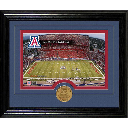 An exclusive photo of the University football field double matted with a minted antique bronze University Logo coin and featured in an 10x12 molded wood frame with an easel back for easy display! Ready to hang on the wall or display on your desk or shelf