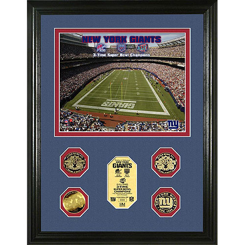 The Highland Mint presents the New York Giants Super Bowl Photo Mint. This framed collectible commemorates the New York Giants Championships in a unique way. Presented in a 14 x 18 black molded wood frame team colored double matting is an incredible image of Giants Stadium taken during a day game and featuring the Super Bowl Logos for SB 21; 25 and 42. Matted below the photo are four (4) 24Kt Gold plated coins; Super Bowl XXI Flip Coin; Super Bowl XXV Flip Coin; and Super Bowl XLII all featuring the dueling helmets of the team they beat in each game. The other 24KT Gold coin is a New York Giants Gold Team Coin. Matted between the coins is a numbered certificate of authenticity listing the scores of each Super Bowl Game. This is Officially Licensed by the NFL and is limited to 5000 pieces.