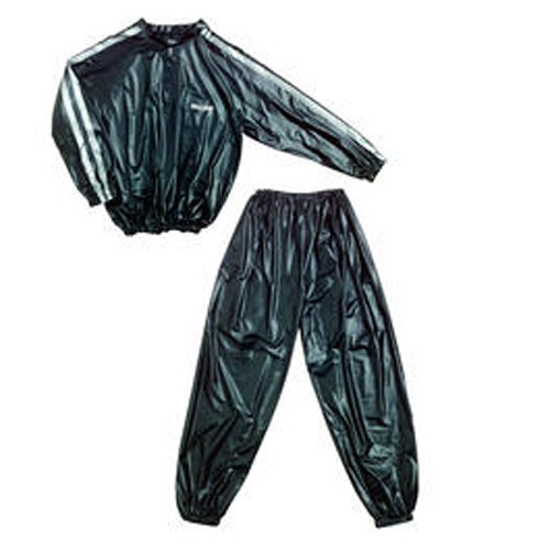 Heavy Duty 2 Piece Vinyl Sauna Suit. 2 Piece heavy-duty vinyl suit retains body heat. Top features 3 snap placket closure; chest pocket and reflective striped sleeves for improved visibility. Pant features elastic waist and cuffs. Generously sized for easy movement. Wipes clean with damp cloth.
