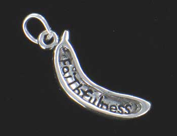 This sterling silver banana charm is part of the Fruit of Virtues series. One side of this charm has the word Faithfulness.- Width: 8 mm (3/8 in)