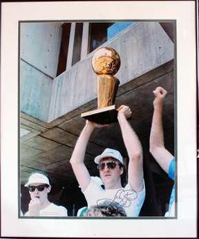 This is an autographed photo of Larry Bird raising the NBA Trophy. Measures 16x20 with a matte and green frame.