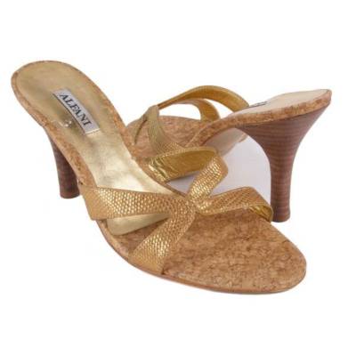 Reptile embossed design. Man-made stacked heel. Cushioned insole. Cork