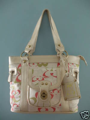 Multi-Colored Signature Pattern with Pearl Faux Leather Trim and Gold Tone Metal Accents Two side Zippered compartments and Front Pouch Pocket Top Zippered opening; fully lined interior with inside zippered compartment and cell phone pouch