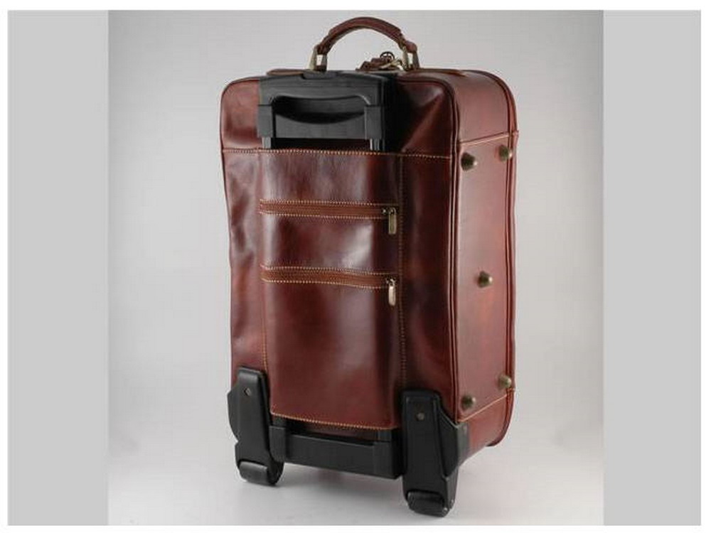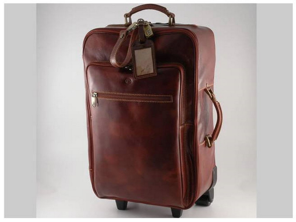 Say “Aloha” with this handsome Honolulu leather travel trolley. This fine travel bag is handcrafted from “genuine” polished calfskin leather and lined with quality peccary skin leather. The interior of the bag features a single roomy main compartment, inside straps to protect clothes, and an inside zip pocket. The firm exterior of the bag has a front pocket with zip closure, a front side compartment, and a backside zip pocket. The Honolulu travel trolley comes complete with a luggage tag, wheels, a telescope handle, and a comfy leather handle. There’s also a secure zipper closure to ensure safekeeping of all your personal belongings.