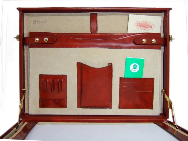 The structure is made of wood, bandaged with fine cowhide, vegetable tanned and dyed by hand. It has a divider / desk that divides the clothes from the department documents. In the ward office has 3 pockets bellows port documents, mobile phone pocket, Penholder and port cards. Closures with combination of brass, mounted on the sides and give a very elegant style. Including cotton cloth bag plush.