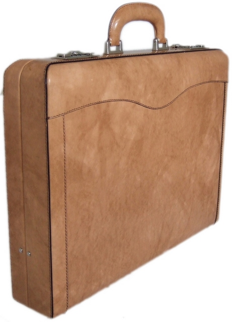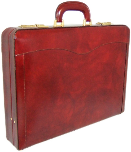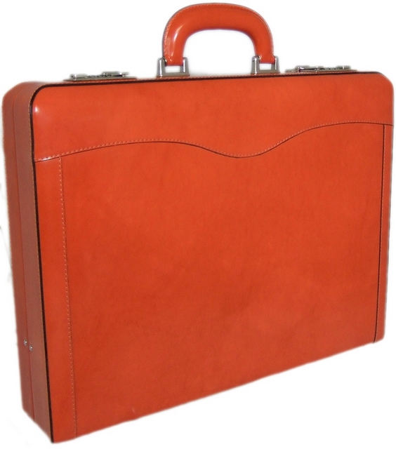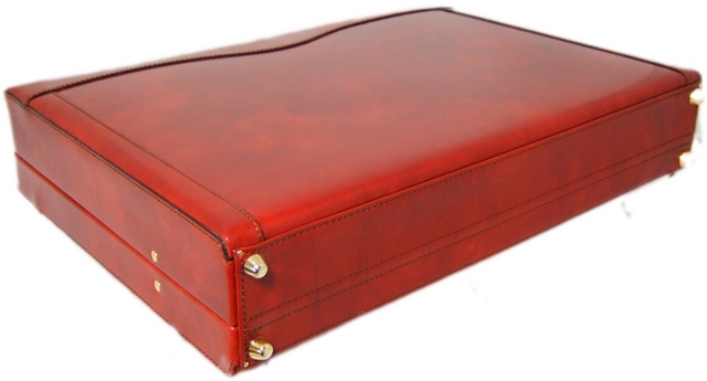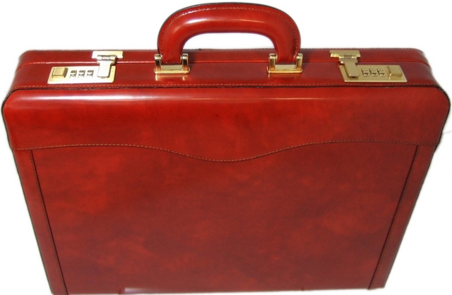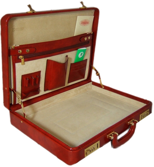 This high class polished hand printing leather attach case have wood structure. There are compartments for document with divisor. Also there are 3 pen holders, a cell phone holder and open pockets for business card. It closes with code lock. Dust bag included.