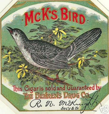 McK's Bird Vintage Cigar Box Label Print - This Cigar is sold and Guaranteed by The Behrens Drug Co.