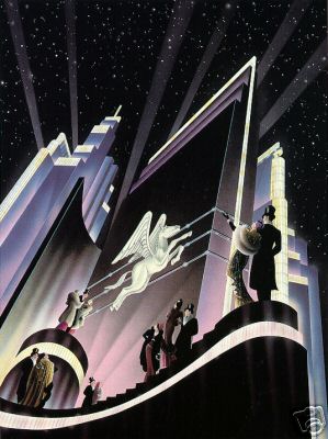 Extravaganzas, such as those produced by Radio City Music Hall, the Ice Follies, and early Hollywood musicals are inspiration for Hoppe's special flair for theatrical imagery. The gaiety and splendor of his blithe dancers and grandiose settings recall the vibrant era of Busby Berkeley and the Ziegfeld Follies. Enamored of the great architectural renderings of the 1920's and 1930's, Hoppe deftly blends urban starkness with post-modern romanticism. Graced with a patina of sophisticated elegance, his cityscapes emerge with the texture of magic.