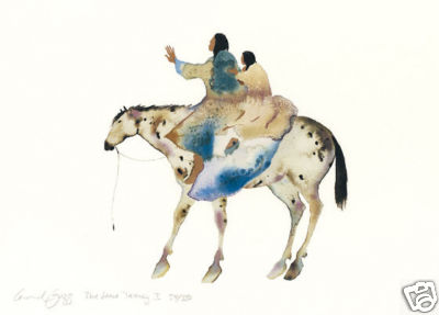 Carol Grigg was born in Portland in 1942. She grew up in Lake Oswego and has always lived in Oregon. She is divorced and has two children, Heidi and Nathan. Carol is part Cherokee Indian and she draws her inspiration from nature and primitive art. "I explore a variety of creative forms; watercolor, oil, collage, clay, inks, music and poetry - anything I can easily and quickly get my hands on. I am influenced by primitive art, especially from the earliest cave paintings. She is best known for desert-colored pastels depicting her signature Native American rider and horse, which symbolize Mother Earth. The images I bring forth are surrounded by space and create a suspended moment in which one might rest. In this I would wish for the ideas of ecstasy, intuition, love and awareness in nature, healing power and spiritual unity to surface into the consciousness of the observer - participant. It is the Great Mother energy I am expressing." She feels strongly about the land and preserving the environment we have left, the animals and preserving what species we have left, the unity of nature and the simplicity of the relationship between man, earth and beast.