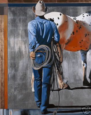 DeVary paints introspective, idealized and sometimes provocative figures, capturing and combining the good feelings associated with the Western myth and the American Dream. His use of bright yellow slickers, hats that shield the eyes, antique chaps, and the cowboy's own natural body language helps create a striking, unique, almost ethereal portrait of the American cowboy and cowgirl.