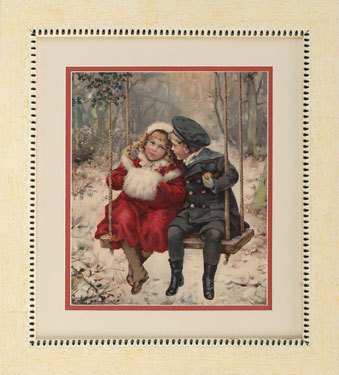 A girl & boy swinging in the snow sharing a moment. Glassed, double matted and framed in a dark mahogany finish.