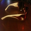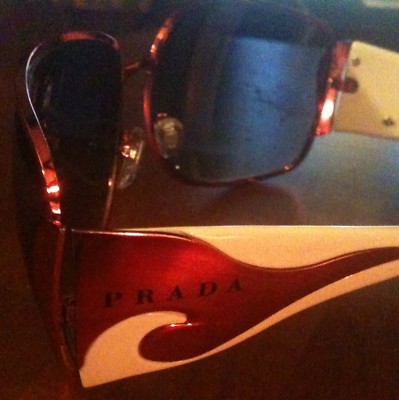For auction or buy it now is a pair of women's Prada Sunglasses . They are very unique in style and the colors are perfect for the upcoming spring/summer season. The arms are white with almost a metallic color pink design. The brand name Prada is written on the side arm in black lettering. It's also on the front right lens at the top. These stylish Prada shades are beautiful and noticeable! They are in pre-owned great condition. I've only worn them a handful of times. I'm happy to send as many additional photos as you'd like. Feel free to contact me with any questions or for more details. I don't have any of the packaging or additional items that may have come with these Prada sunglasses as they were a Gift and have mostly been put up. I do have a soft leather like or leather sunglass holder I can include with this item if you would like it with this item. Just specify in instructions box at checkout. Please bid with confidence as my feedback score is 100% as a seller and buyer. I accept Paypal for payment on all items I list.