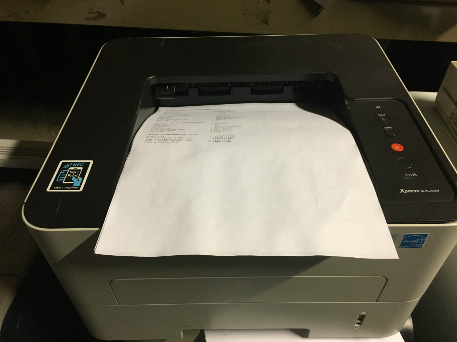 The Samsung M2835DW is light and compact, yet built with features! It prints a perfect test page and is in great physical condition. It includes a USB interface, a power cord, and a used toner cartridge. The page count is only 9500 pages! The drum may need to be replaced soon.