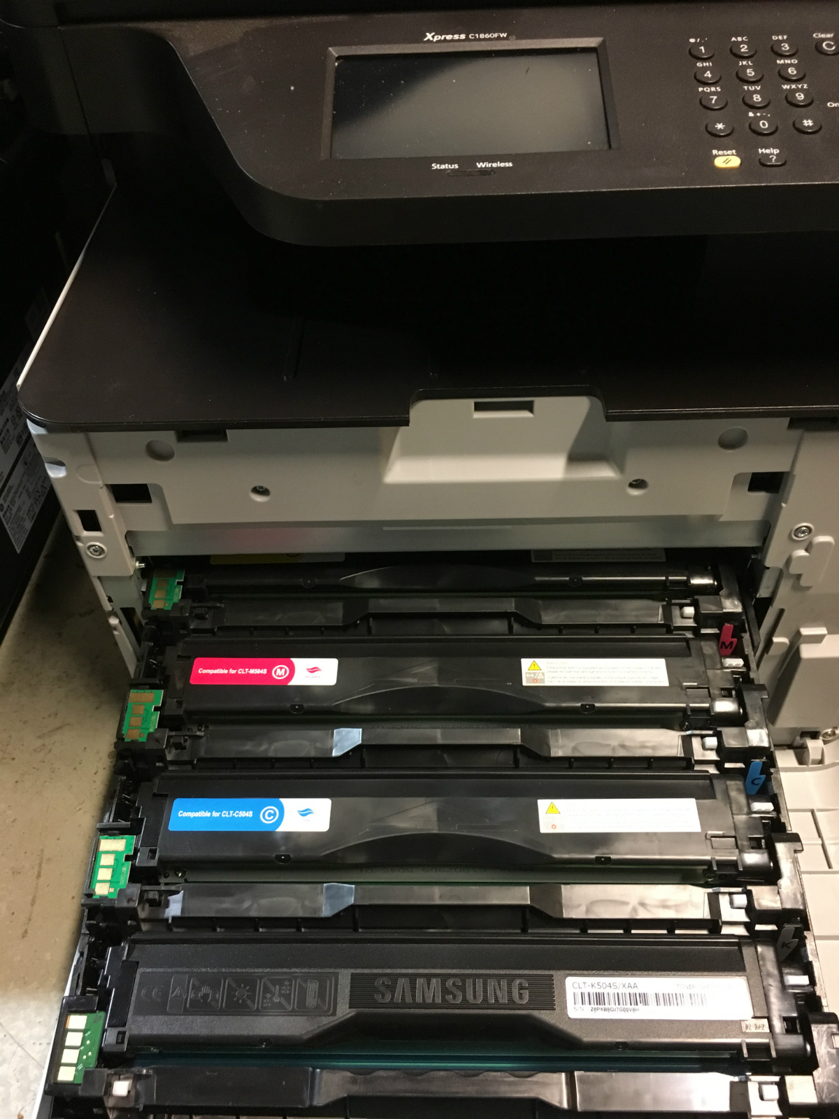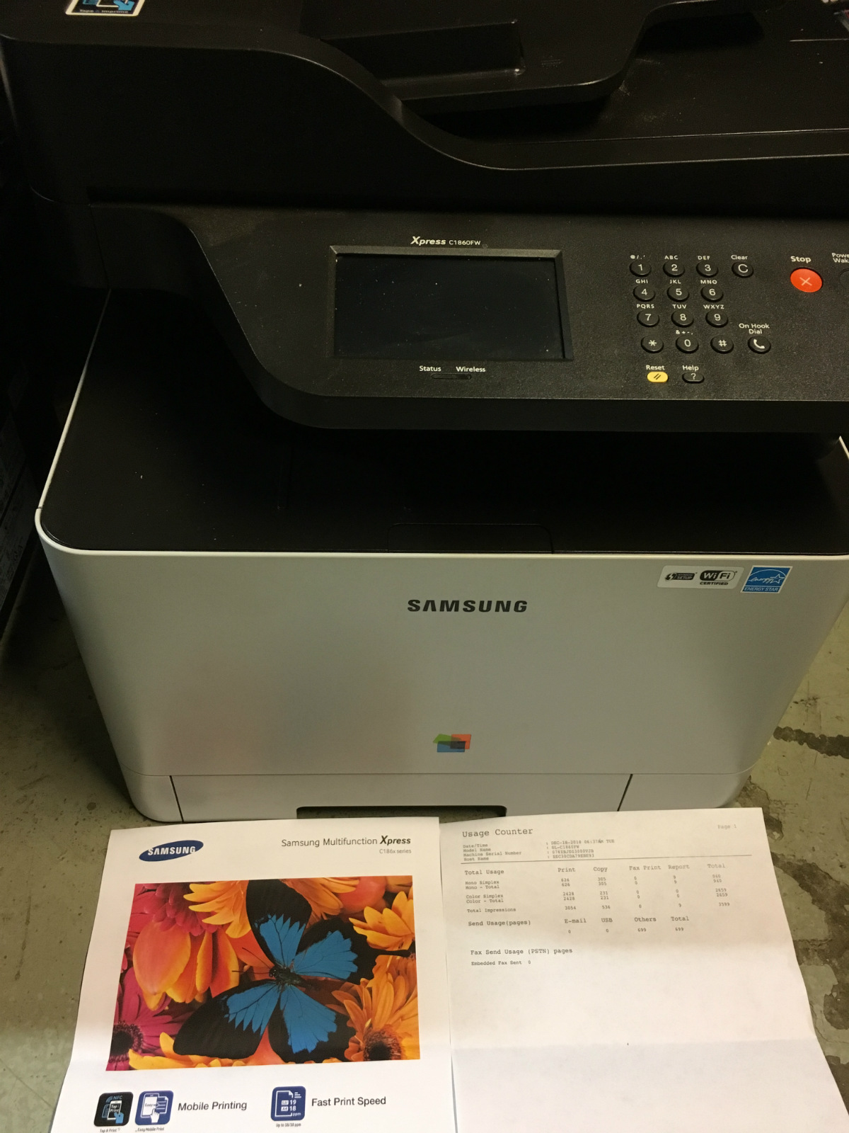 The Samsung C1860FW is a color multi-function printer built with features! It prints a perfect test page and is in great physical condition. It includes a USB/networking interface, a power cord, and used toner set( may need to be replaced & not guaranteed).