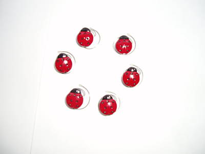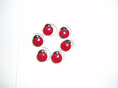 You are bidding on 6 tiny red opaque ladybug hair swirls. They are just adorable and will look so cute in your hair . They are mounted on a sturdy tarnish resisitant silver tone wire . Each lady bug is 1/2 inch in size.